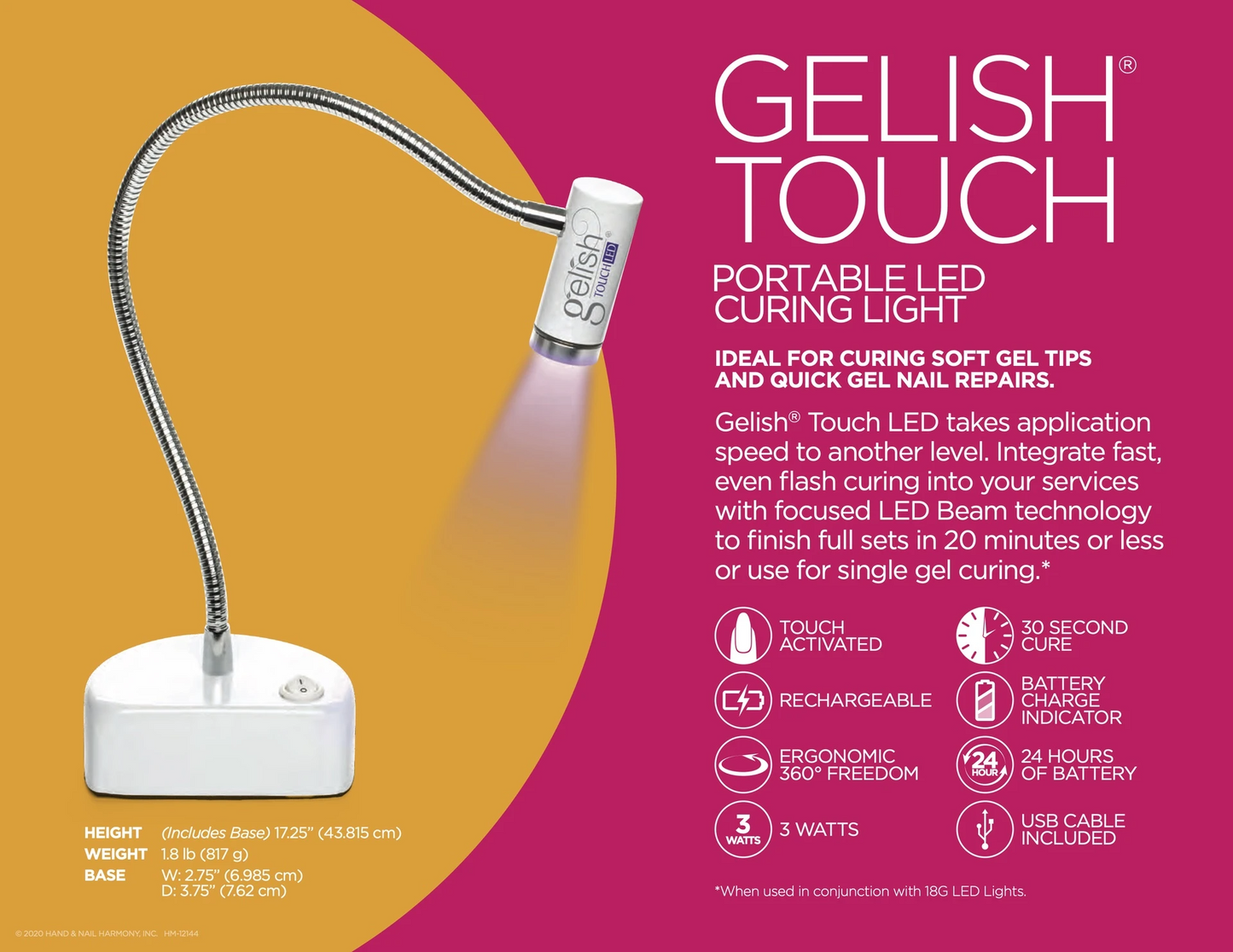 GELISH® TOUCHPORTABLE LED CURING LIGHTIDEAL FOR CURING SOFT GEL TIPS AND QUICK GEL NAIL REPAIRS.Gelish® Touch LED takes application speed to another level. Integrate fast, even flash curing into your services with focused LED Beam technology to finish full sets in 20 minutes or less or use for single gel curing.*